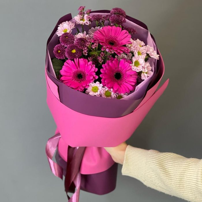 Ваксфлауэр – 1 шт.Лента атласная – 1 шт.Гербера – 3 шт.Сантини – 5 шт.Фисташка – 1 шт.Упаковка дизайнерская – 1 шт.