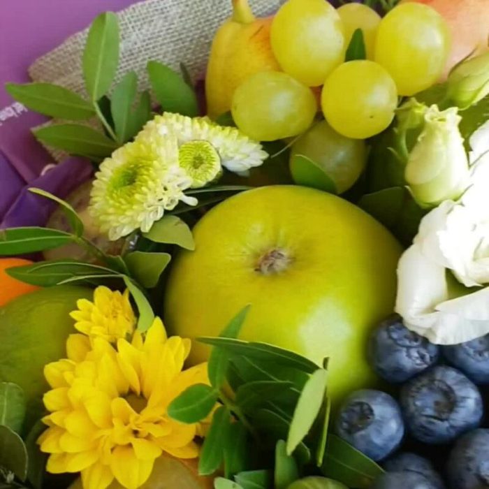 Хризантема кустовая – 1 шт.Хризантема Сантини – 1 шт.Эустома – 1 шт.Виноград – 150 гр.Киви – 7 шт.Фисташка – 3 шт.Яблоко – 6 шт.Лайм – 6 шт.Груша – 5 шт.Голубика – 200 гр.Нектарин – 7 шт.Кумкват – 120 гр.Транспортировочная коробка – 1 шт.крыжовник – 115 гр.