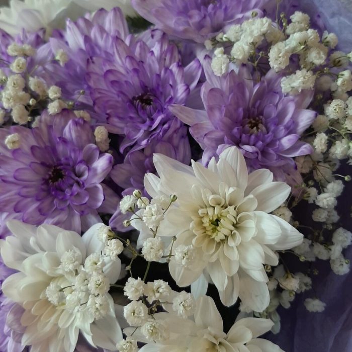 Хризантема кустовая белая – 3 шт.Хризантема кустовая крашенная – 4 шт.Гипсофила – 3 шт.Упаковка дизайнерская – 1 шт.