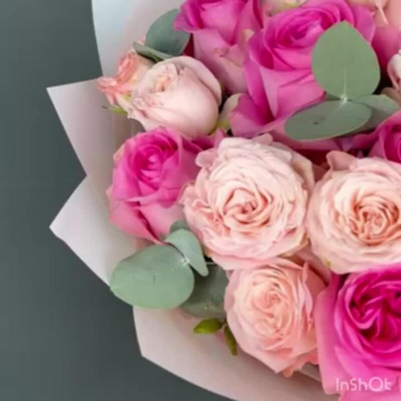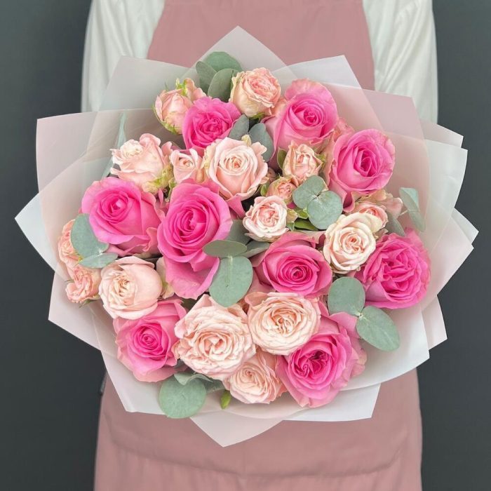 Авторский букет из розовых Пионовидных Роз и Эвкалипта