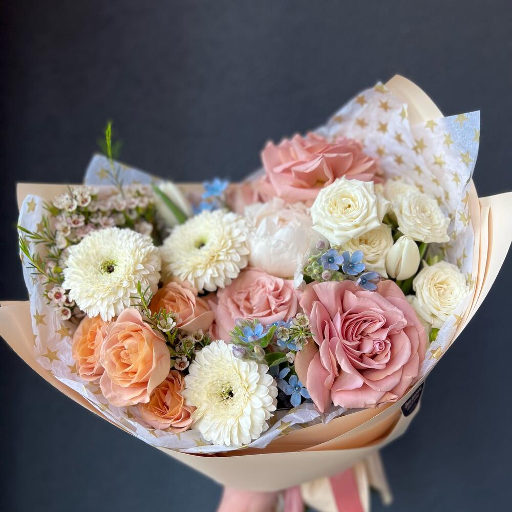 Авторский букет с пионовидными розами, пионом и Герберами «Айс латте»