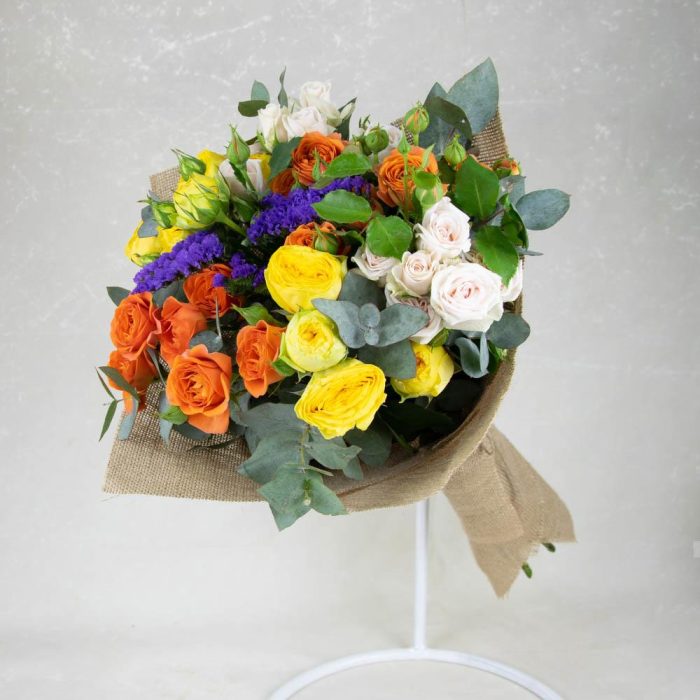Bouquet in red and yellow colours for those who like all natural. The bouquet is wrapped in natural Kraft in the same tones. All is simvoliziruet closeness to nature. The gift usually is applied to our card with a beautifully printed text of your message. To bouquets usually come with a recommendation for the care and explaining why. Upon delivery, the temperature in a car courier controlled by us depending on season.