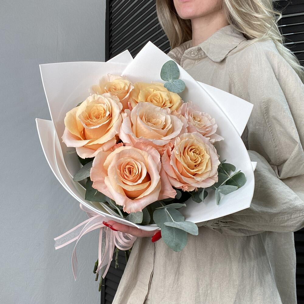 Эвкалипт – 4 шт.Упаковка дизайнерская – 1 шт.Роза шиммер – 7 шт.