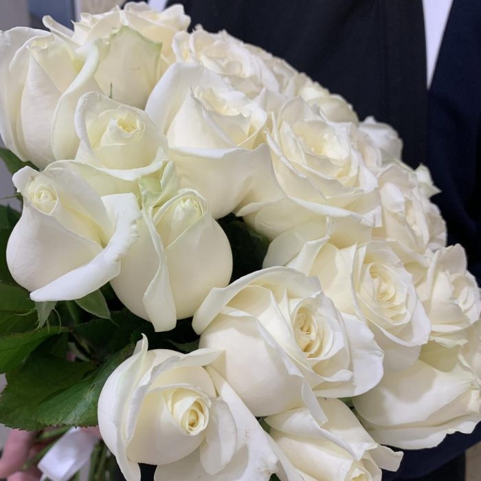 Классический букет из 25 белых роз можно подарить понравившейся девушки, также прекрасным поводом для данного букета будет первое свидание или подарок на свадьбу.