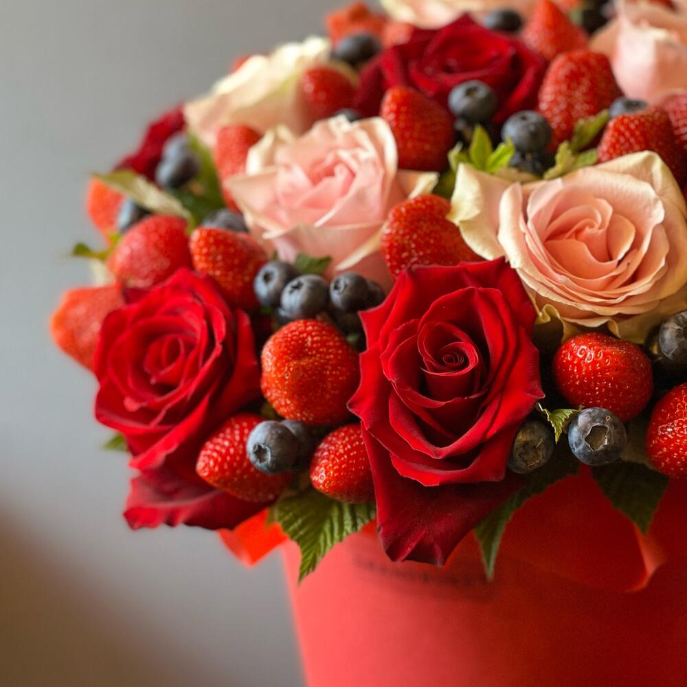 Клубника – 250 гр.Лента атласная – 2 шт.Шляпная коробка – 1 шт.Голубика – 125 гр.Оазис флористический – 2 шт.зелень декоративная – 17 шт.розы микс – 15 шт.работа флориста – 1 шт.