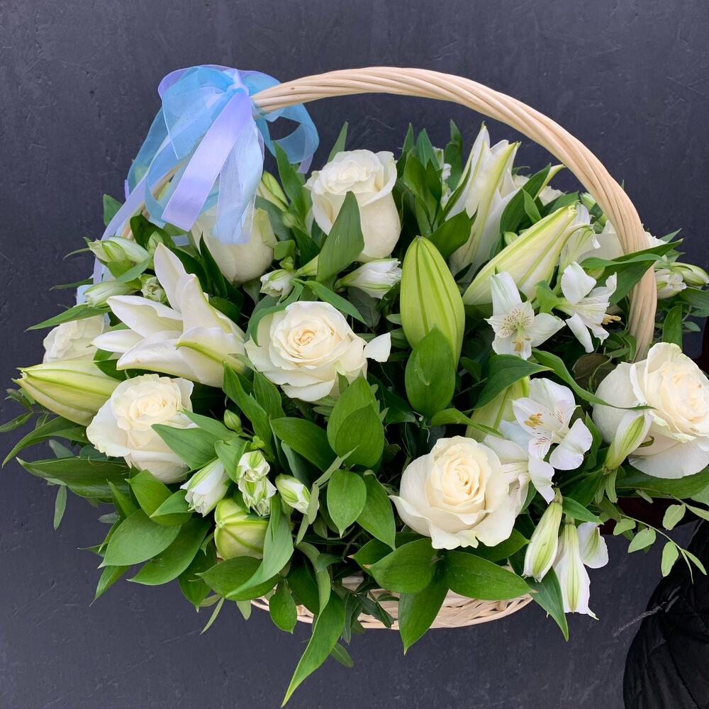 Корзина с белыми розами, лилиями и альстромериями «Весенний сад»