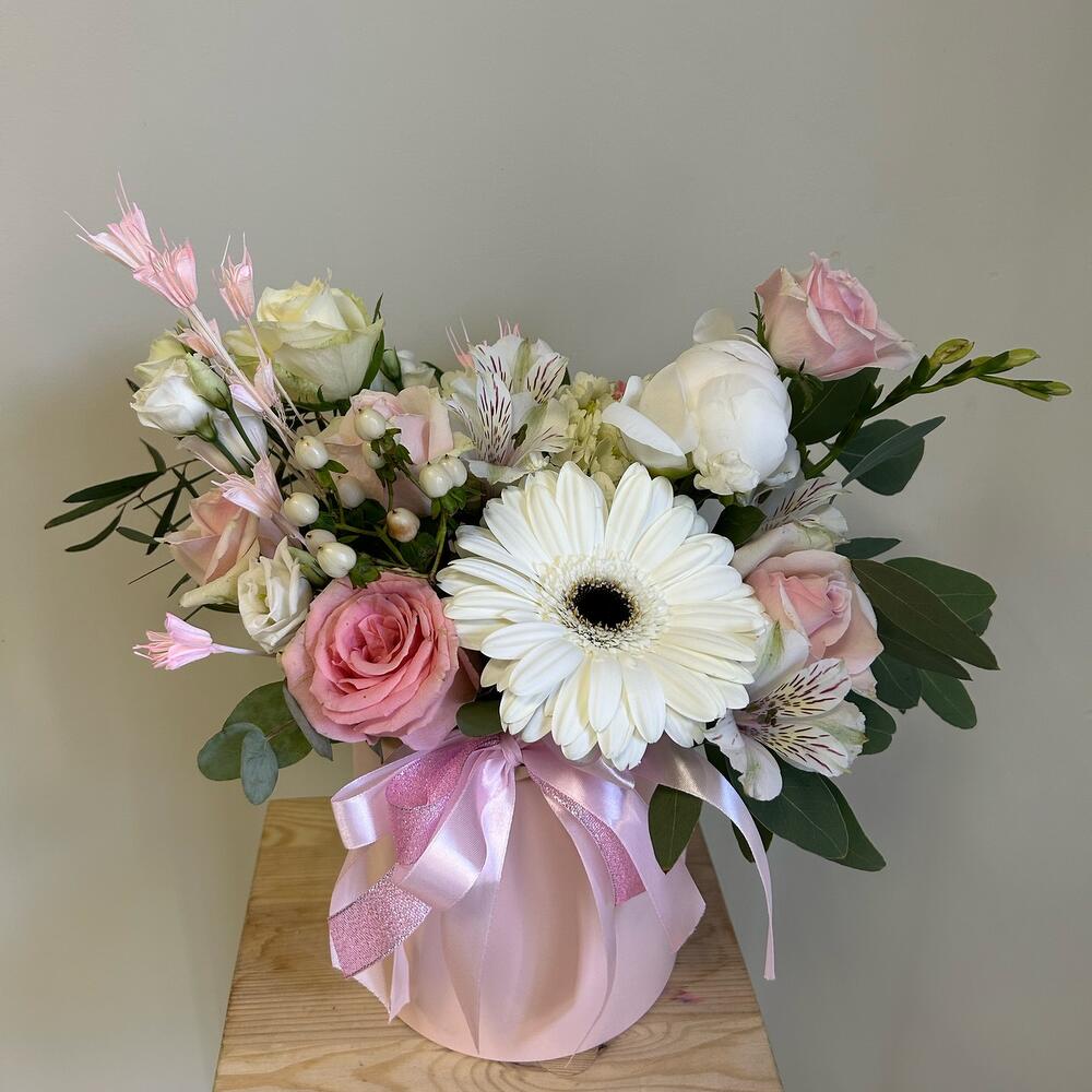 Гербера – 1 шт.Пион – 1 шт.Роза – 5 шт.альтстомерия – 2 шт.Эвкалипт – 1 шт.Гиперикум – 1 шт.Сухоцвет – 2 шт.Коробка шляпная – 1 шт.Оазис флористический – 1 шт.