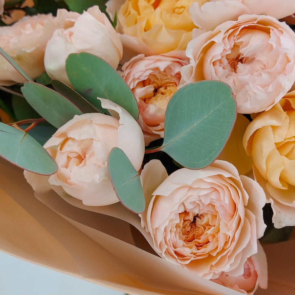 Роскошные пионовидные розочки Джульетта с веточками эвкалипта. Такой букет всегда уместен и подойдёт для любого повода: День Рождения, именины, годовщина свадьбы, рождение ребенка, 8 марта, День Святого Валентина, выпускной и т.д. Можно вручить маме, сестре, подруге, коллеге, учителю, любимой.